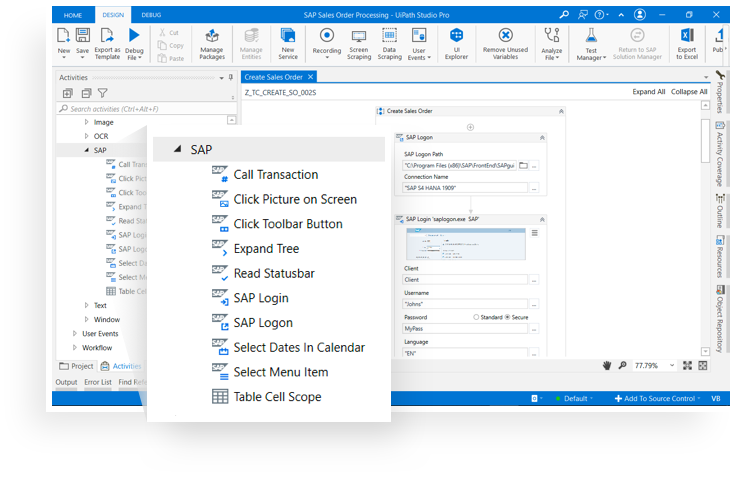 Dit is de meest eenvoudige en snelle manier om UiPath te integreren met SAP. UiPath Studio wordt gebruikt om de acties van een gebruiker op de SAP GUI te simuleren, zoals het uitlezen, invoeren en verwerken van gegevens.