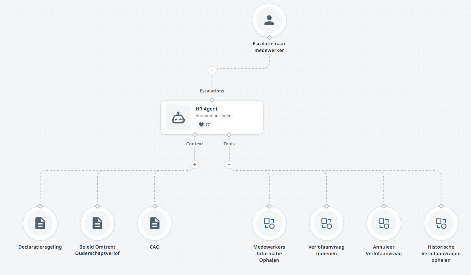 De eerste stap was het analyseren van de binnenkomende HR-vragen die het meest voorkomen. Daarbij is gekeken welke typen vragen structureel binnenkomen, welke applicaties, systemen en documenten HR gebruikt om deze vragen te beantwoorden en welke stappen HR-medewerkers uitvoeren om tot een antwoord of document te komen. Deze analyse vormde de basis voor de eerste scope van de agent.